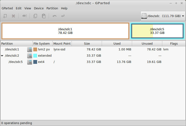 My first plan was to simply create an ext4 partition to replace the old one, but then I realized I could use LVM for this. So I fired up a Linux Mint live usb, created an ~80 GB lvm partition (using gparted), created a new logical volume on an ssd volume group (using lvcreate), then copied the /home filesystem to the new logical volume (using dd). At first I had been worried about moving the /home partition since each home directory is encrypted, and I wasn’t sure what mechanism was used to decrypt it. However, looking at /etc/fstab there didn’t seem to be anything fancy going on. All I had to do was comment out the old line mounting /home and add: